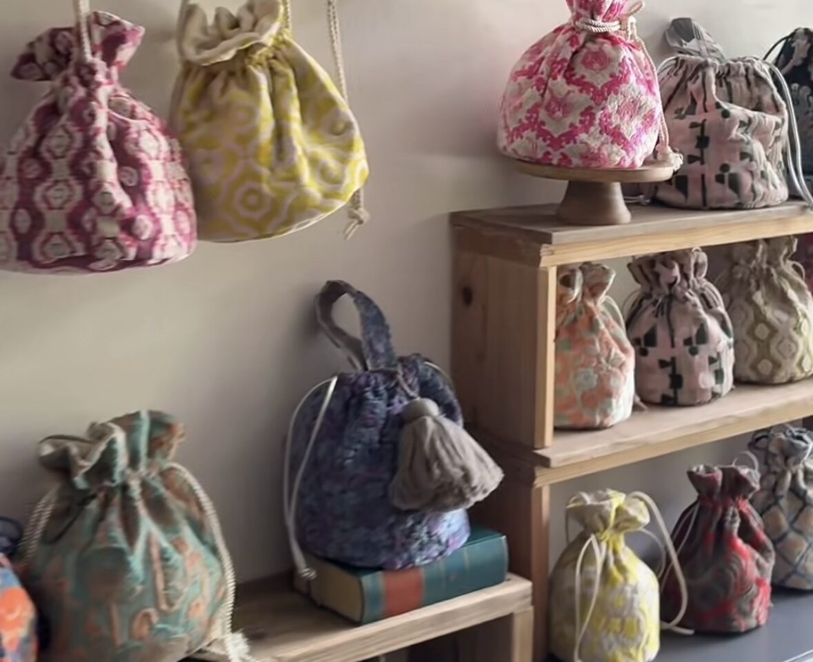 こちらの巾着は和歌山県の昔ながらの技法で織られた金華山織物の生地をつかって作られているそうです。